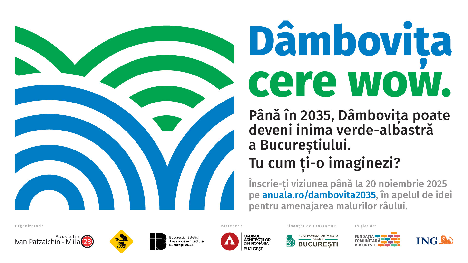 Cum poate deveni Dâmbovița, peste un deceniu, o axă verde și accesibilă care să aducă natura și comunitatea mai aproape de inima orașului? Aceasta este viziunea care stă la baza apelului internațional de idei „Dâmbovița 2035”, lansat de Asociația Ivan Patzaichin – Mila 23, Nod Makerspace și Anuală de Arhitectură București, alături de Platforma de mediu pentru București, inițiată de Fundația Comunitară București și ING Bank România, în parteneriat cu Filiala București a Ordinului Arhitecților din România.